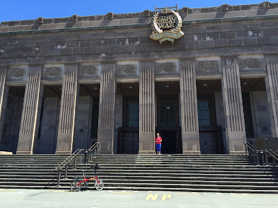 We biked up the drive to the Dominion Museum. This impressive building was the National Museum and National Art Gallery until 1998, when its collections were transferred to Te Papa (or the Museum of New Zealand Te Papa Tongarewa, to give it its official name). It is now partly occupied by Massey University, and currently, during the centenary of the First World War, the building houses the Great War Exhibition, created by Sir Peter Jackson.